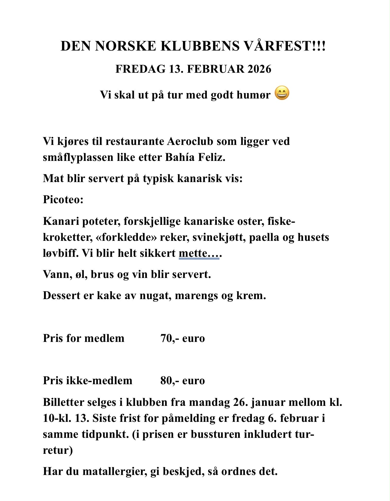 Klubbens vårfest fredag 13. februar Lagt ut av Randi Grung-Olsen | 23.01.26 | Ukategorisert I år arrangerer vi én vårfest for alle i klubben 👏 Bilde: Restaurante Grill Aeroclub